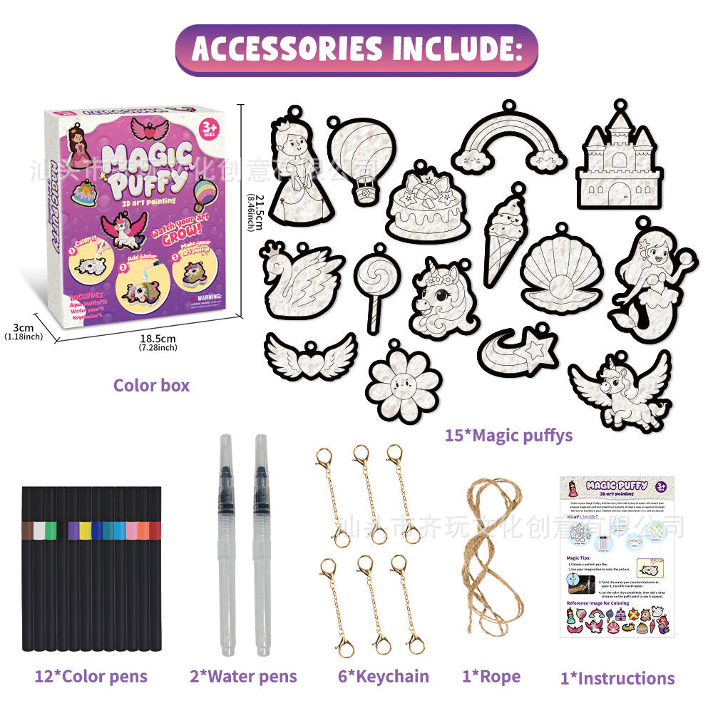 VARÁZSLATOS 3D PUFFY HATÁS - Ébressze fel gyermeke fantáziáját, miközben figyelik, ahogy lapos rajzaik egy csepp vízzel varázslatos módon puffadt 3D-s műalkotásokká alakulnak, és így egy örömteli és meglepő művészi élményt nyújtanak.