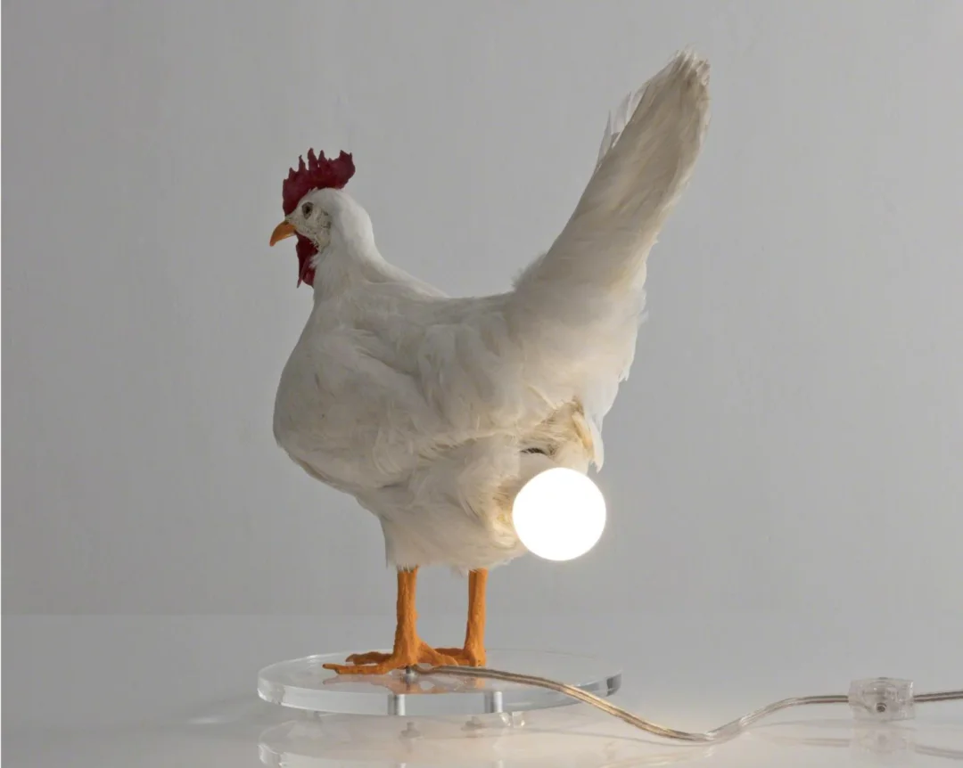 A Taxidermy Chicken Egg Lamp elektromos alkatrészei a csirke talpán találhatók, az izzó pedig a csirke által feltételezett tojást helyettesíti. A csirke tojás lámpa mérete 14,5 hüvelyk hosszú, 6 hüvelyk széles és 15,5 hüvelyk magas.