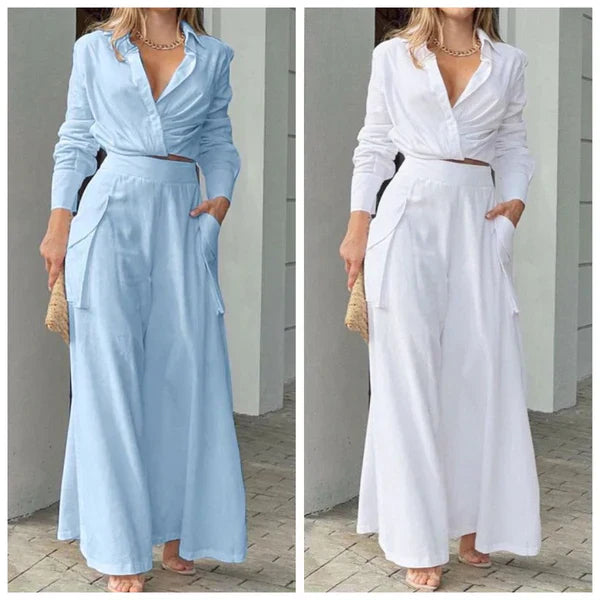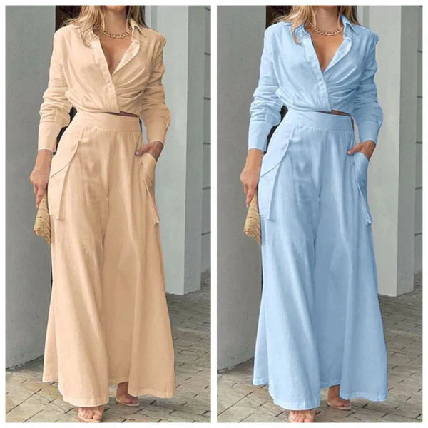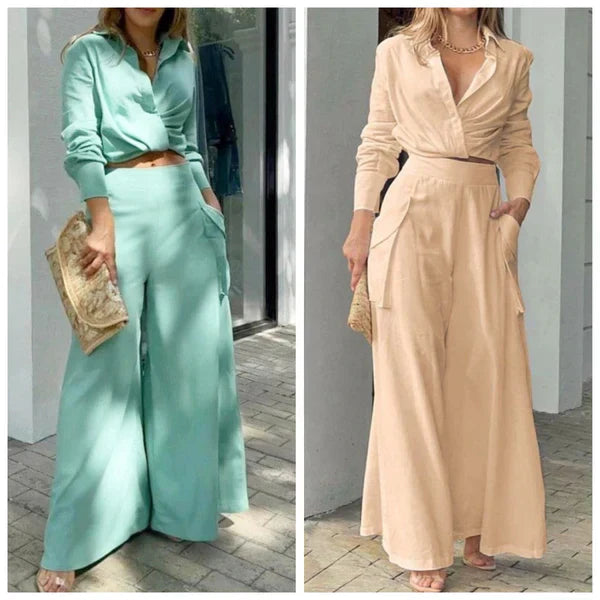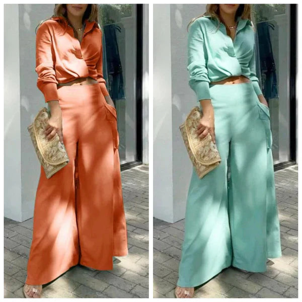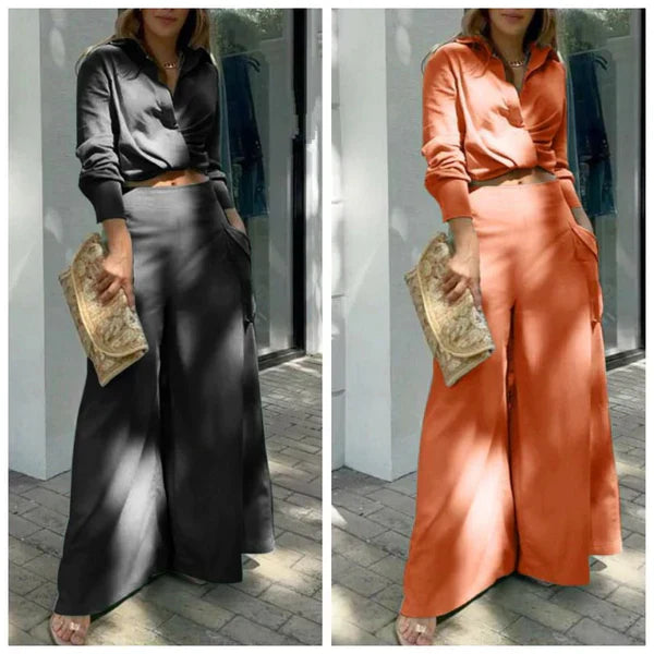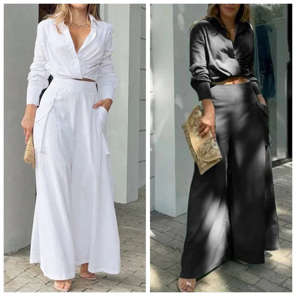 1 * ElegĂĄns kĂ©trĂ©szes szett: HosszĂș ujjĂș, mandzsettĂĄs felsĆ Ă©s magas derekĂș nadrĂĄg.