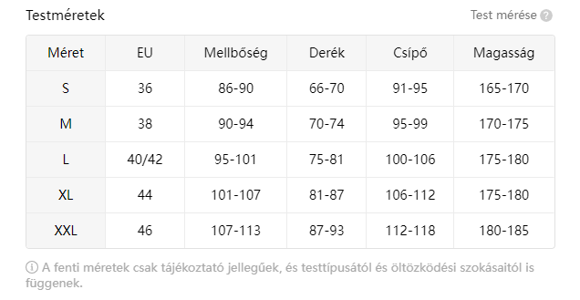 - KĂ©rjĂŒk, a mĂ©ret kivĂĄlasztĂĄsĂĄhoz szigorĂșan kövesse a mĂ©rettĂĄblĂĄzatot. Ne vĂĄlasszon közvetlenĂŒl a szokĂĄsai szerint.