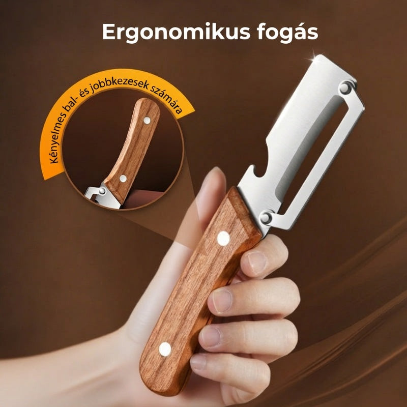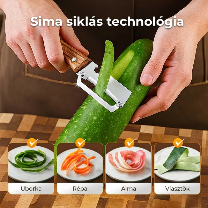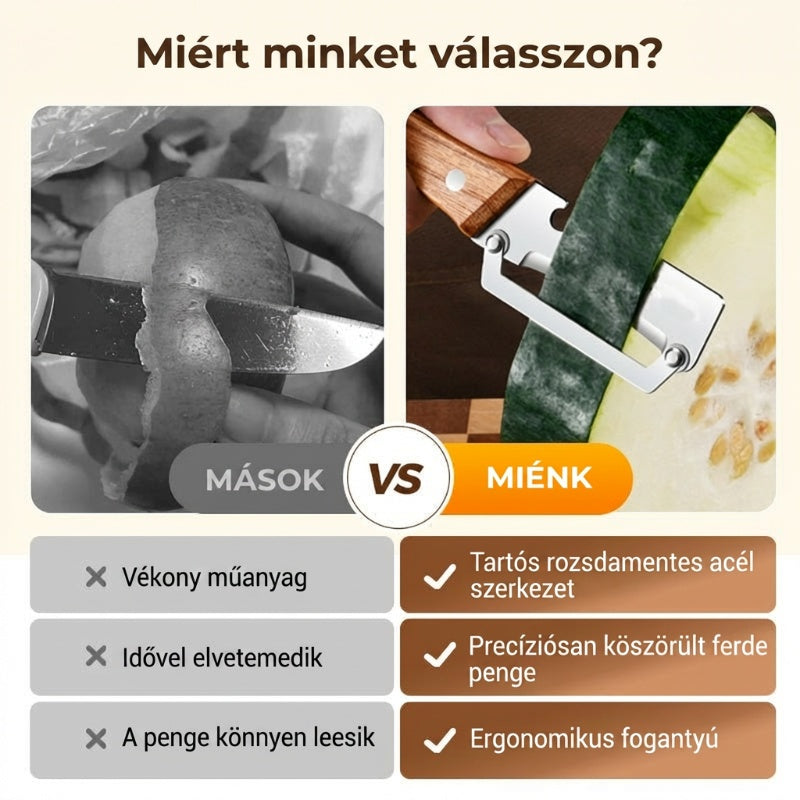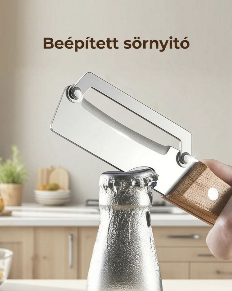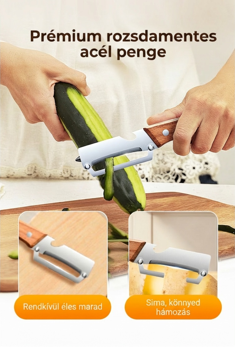 BOROTVAÉLES PENGÉT- Precíziósan köszörült rozsdamentes acélból készült a könnyed hámozáshoz. Átsiklik mind a puha, mind a kemény termékeken, minden alkalommal papírvékony, egyenletes héjat eredményezve. Nincs többé egyenetlen szél vagy kárba vész hús – csak sima, professzionális eredmény.