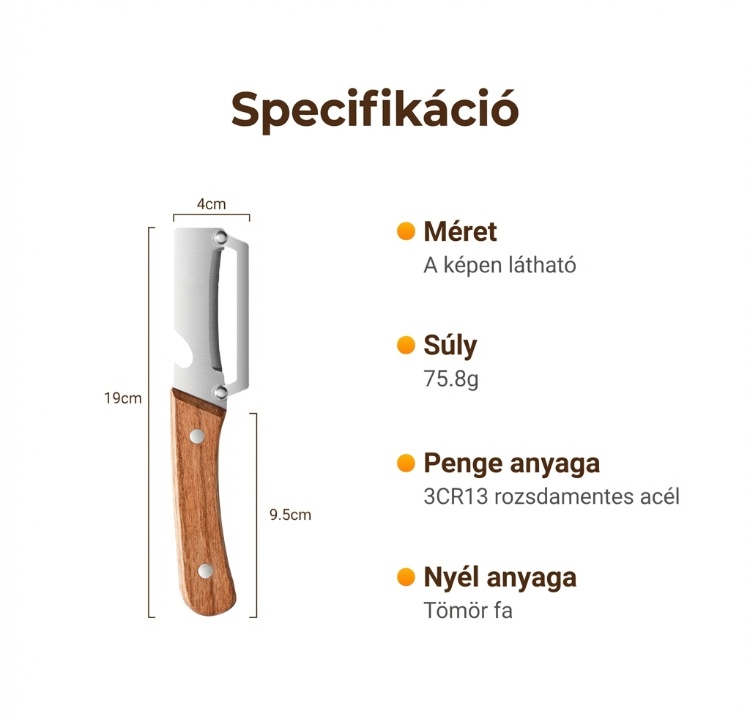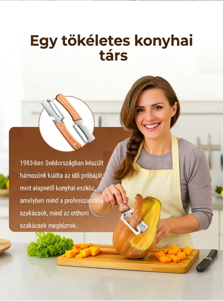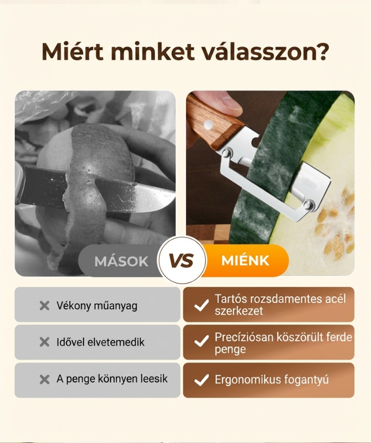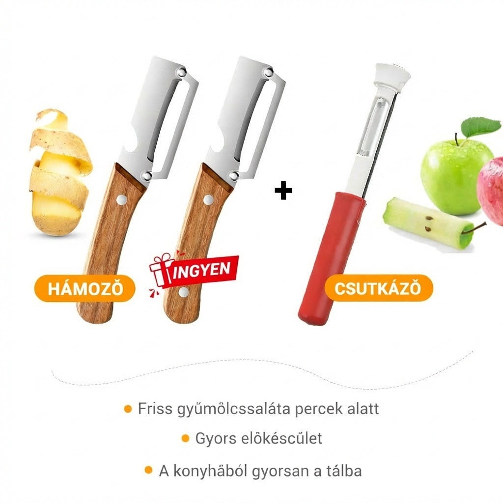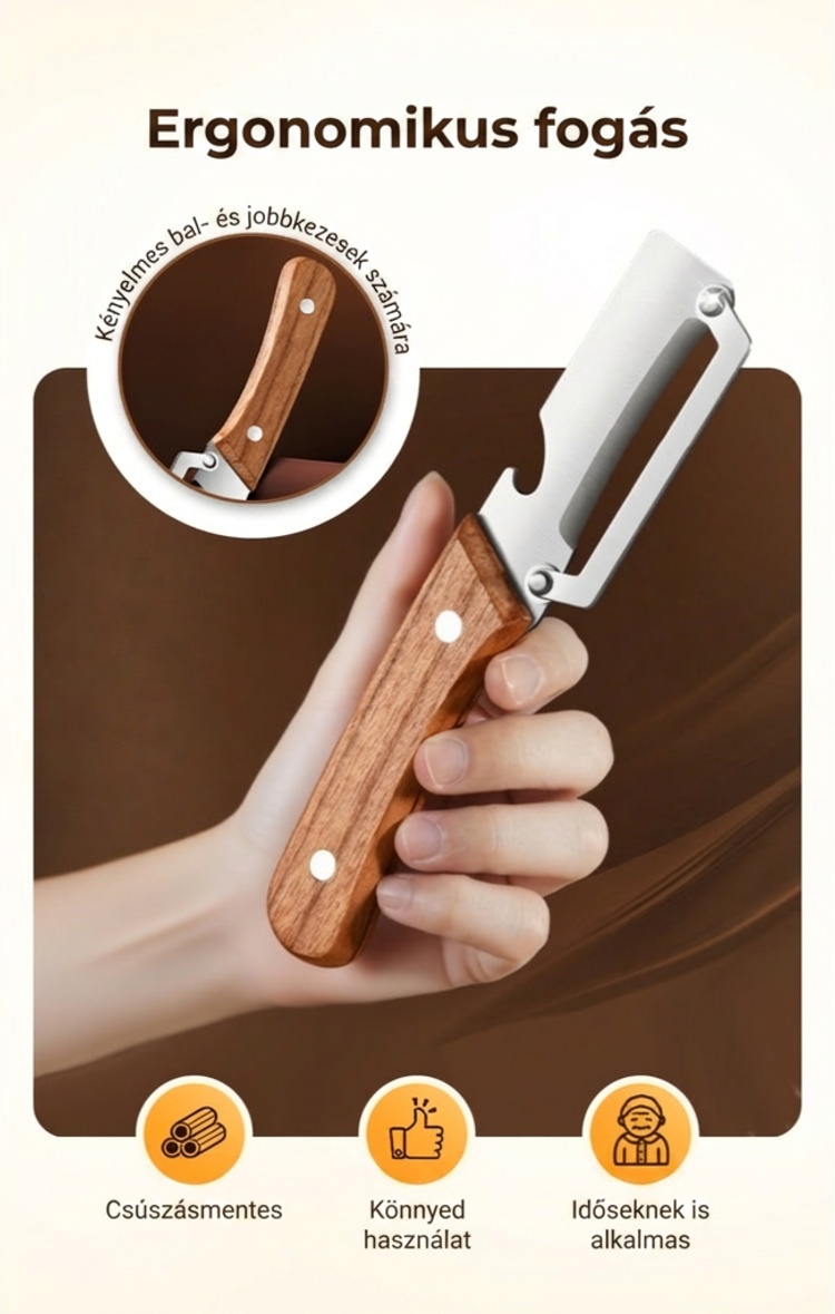 BOROTVAÉLES PENGÉT- Precíziósan köszörült rozsdamentes acélból készült a könnyed hámozáshoz. Átsiklik mind a puha, mind a kemény termékeken, minden alkalommal papírvékony, egyenletes héjat eredményezve. Nincs többé egyenetlen szél vagy kárba vész hús – csak sima, professzionális eredmény.