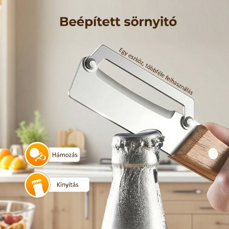 KETTŐS FELHASZNÁLÁSÚ FUNKCIONALITÁS- Praktikus üvegnyitóként is használható italokhoz. Sokoldalú eszköz, amely zökkenőmentesen használható a konyhai előkészítéstől a szórakozásig, így minden otthon kötelező darabja.