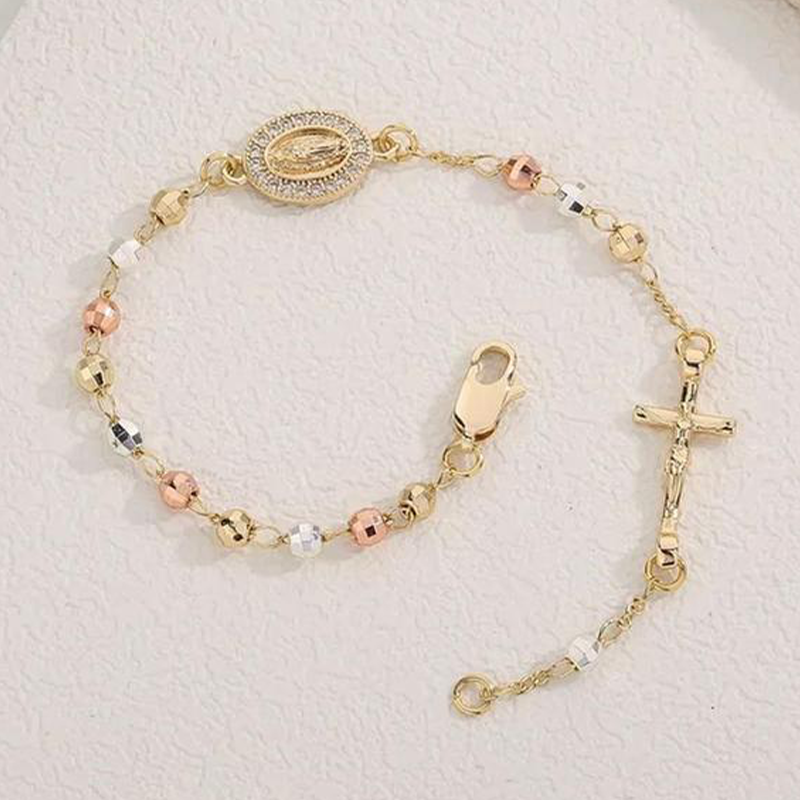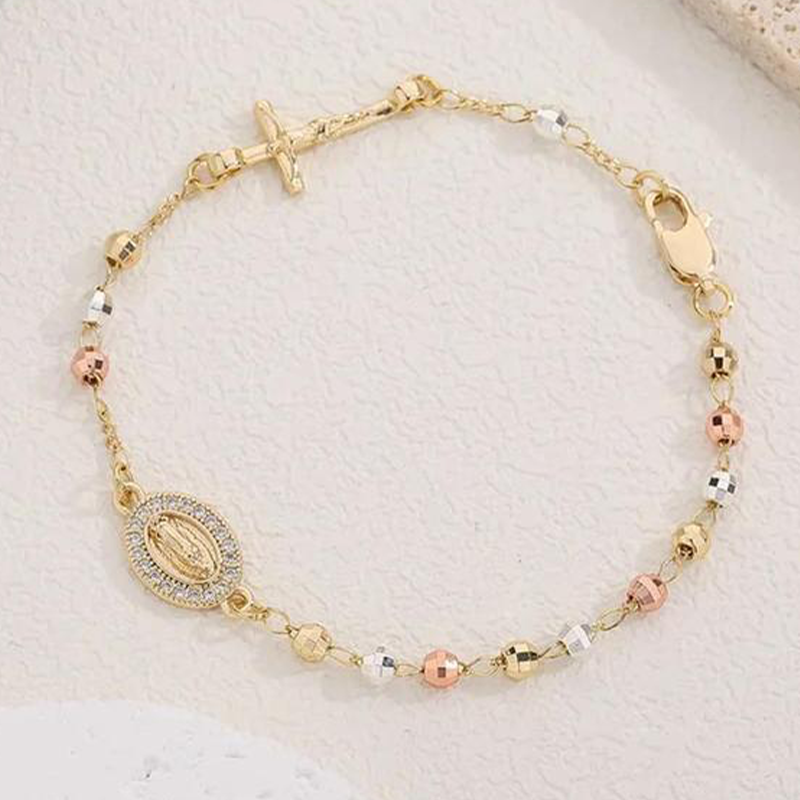 BÖLCSÖS SZIMBÓLUMOK - Részletgazdag kereszttel és csillogó, strasszokkal kirakott medállal díszített karkötőnk a hit kecses kifejezője, és kifinomult, jelentőségteljes kiegészítője stílusának.
